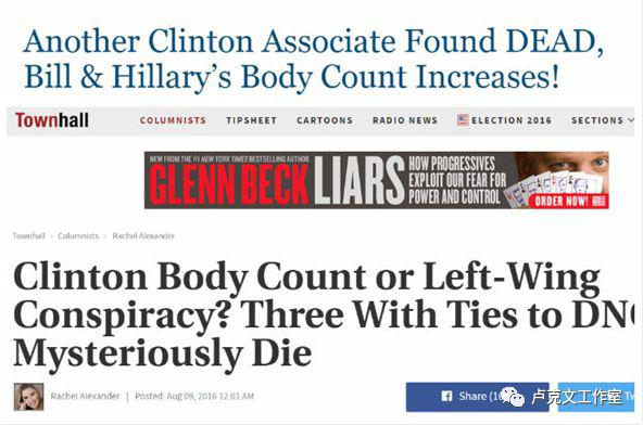 Vince Foster – 前白宫顾问,希拉里克林顿在小石城律师事务所工作时的同事。死于头部枪杀,判定为自杀。他当时即将出庭作证推翻希拉里拒绝交给国会的有关白水门事件的记录。据称他与希拉里有婚外情。