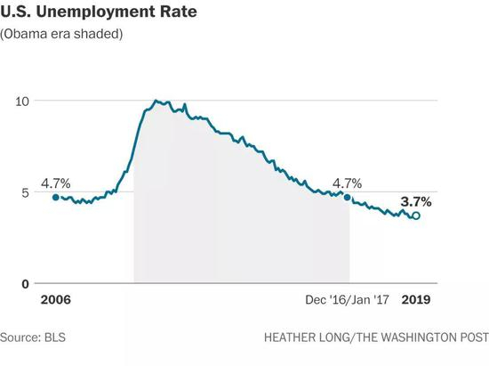 美国的失业率处于近50年来的最低水平,这是特朗普值得骄傲的成绩之一。但许多经济学家指出,自2011年以来,美国失业率一直稳步下降,因此,很难看出特朗普上任后对该趋势有何影响。