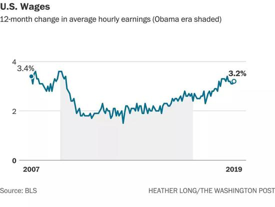 奥巴马执政的大部分时期,工资水平一直低迷。特朗普上任以来,平均小时工资出现上升,并且十多年来首次以每年超过3%的速度增长。尽管,关于工资增长有多少归功于特朗普仍存在争议,但其减税政策与随之而来的企业乐观情绪可能发挥了一定作用。