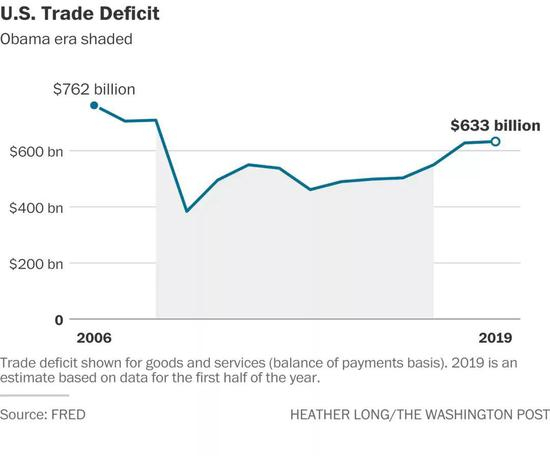 贸易逆差在大衰退期间有所下降,此后开始上升,但这通常是美国经济强劲增长的迹象之一。特朗普竞选时主张降低贸易逆差,但他上台后,贸易逆差不降反增。