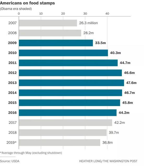 2013年,大约七分之一的美国人领取食品券,因为人们很难找到高薪工作。在奥巴马执政期间,该数字略有下降。自特朗普执政以来,由于更多美国人找到了工作,且政府对继续领取食品券的要求收紧,该数字进一步下降。