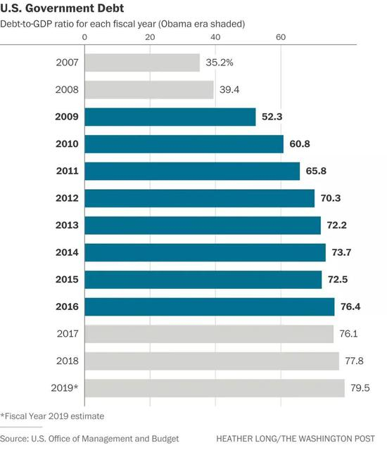 每财年债务占GDP的比率(蓝色部分为奥巴马时期)