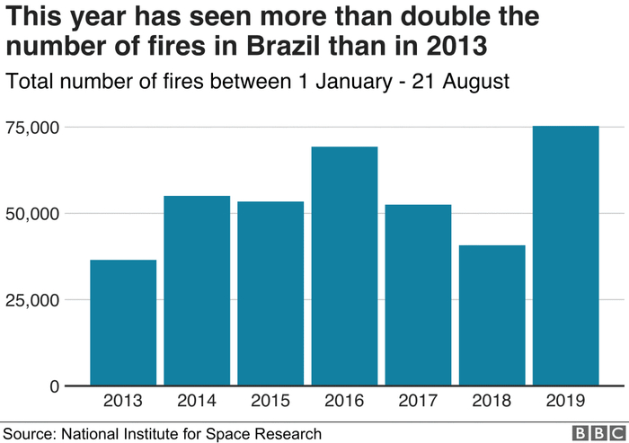 数据显示,今年迄今为止整个巴西的火灾已超过7.5万起,而2018年同期仅有4万起火灾。