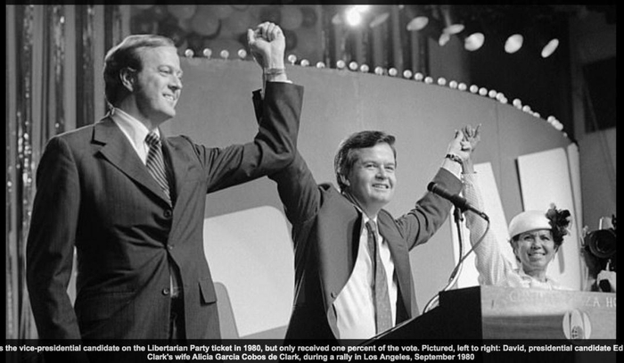 1980年 大卫与爱德华·克拉克组合以自由意志党参加大选为了推广自由意志主义,科赫兄弟大力投资相应的智库机构,是著名的卡托研究所(Cato Institute)和人文研究所(the Institute for Humane Studies)的背后金主老板。前民主党参议院领袖哈里·里德(Harry Reid)几乎整个政治生命都在与科赫兄弟作斗争,在他眼里,这两兄弟是大骗子,灼烧美国政治的火焰山,否认气候变暖的大路障。