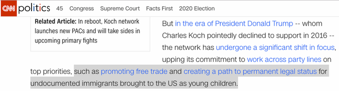 不过对于川普,一开始科赫兄弟算不上积极支持者。2016年大选前,查尔斯评价希拉里和川普时说过一句话暴露了心机,“癌症和心脏病之间的选择”。科赫兄弟是传统保守派理念自由贸易的信徒,这点跟满世界打毛衣站、讲究贸易保护、孤立主义的川普八字不合。他们也是为无证移民DACA人群(青少年时代跟随无证父母来到美国的人,全美约有200万;其中约有80万已经成年)谋求合法身份的积极推动者。他们对无证移民的支持,也带有降低公司运营成本的经济利益的因素在里面。