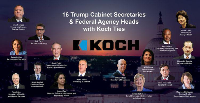 那年大选,因为不喜欢川普的理念,他们把钱主要投资到了参议员级别的地方选举上。但是,这些毕竟只属于保守派的内部矛盾。有人算了一下,在川普的内阁成员中,其实有多达16人与科赫兄弟有着千丝万缕的联系。其中,国务卿蓬佩奥(Pempeo,图中左上第一个)跟科赫兄弟关系最铁,从他结束学生时代从西点军校毕业开始,遇到的第一个贵人就是科赫兄弟。可以毫不夸张地说,蓬佩奥从政有多久,他做科赫集团的“政坛大使”就有多久。
