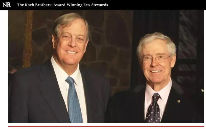 科赫兄弟的公司的石化能源产业,因为漏油和污染环境,被罚款无数次,仅从2000年累计至今,屡次罚金叠加高达7.49亿美元。同时他们也被普遍认为,是阻扰气候变化研究的第一推手,也对延误美国转型绿色经济有着不可推卸的责任。矛盾的是,科赫兄弟的公司在过去十年里,在环境保护、运营安全、社区服务和慈善事业方面,也拿过792个奖项。包括美国农业部、环保局在内的部门,都给科赫公司发过奖。慈善他们对于癌症治疗、艺术研究的捐款可谓大手笔,斥资亿万。MIT的癌症研究所以大卫·科赫命名。