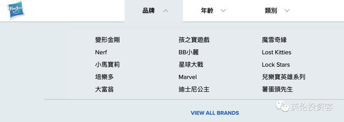 公司目前拥有包括变形金刚、热火、培乐多、淘气宝贝、菲比精灵、儿乐宝、小马宝莉、酷垒、万智牌和地产大亨等品牌。