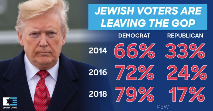 事实上,特朗普上任以来,美国各地的反犹太主义袭击事件数量有所增加。根据美国宗教机构反诽谤联盟(ADL)的统计,2018年美国发生了1800余起反犹太主义事件,与2015年相比增长了99%,其中就包括了2018年10月的“生命之树”犹太教堂射击案。与此同时,美国犹太人群体似乎也更加统一地倒向民主党阵营。美国犹太人一向被视为民主党的票仓,根据皮尤研究中心发布的信息,在2016年的总统大选中,希拉里·克林顿获得了72%的美国犹太人选票,而在2018年的国会选举中,犹太人群体为民主党候选人投票的比例上升至79%。