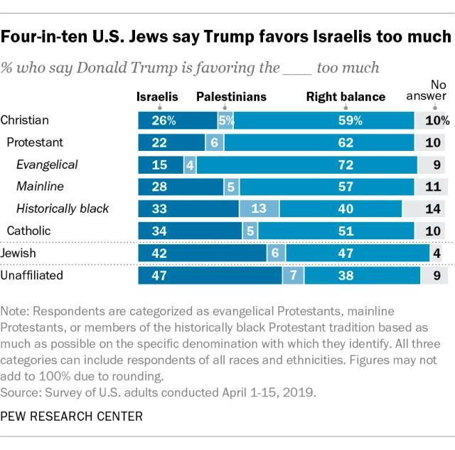 显然,与仅占美国选民2%-3%的犹太人群体相比,占美国人口25%的福音派基督徒显然更具影响力与“诱惑力”。除此以外,在关于以色列政策方面,福音派也更加支持特朗普的选择。皮尤研究中心在今年5月进行的另一项研究发现,新教徒与福音派人士比美国犹太人更支持特朗普的政策。虽然美国犹太人对以色列有很强的依恋,但他们对特朗普处理以色列-巴勒斯坦问题的评估存在分歧。大约42%的人表示他们认为特朗普过于偏爱以色列人。相比之下,美国的基督徒有更高比例的人认为特朗普在以色列人和巴勒斯坦人之间取得了正确的平衡(59%),而非特朗普过分偏爱以色列人(26%)。在福音派新教徒中,72%的人表示他们认为特朗普在以色列人和巴勒斯坦人之间取得了适当的平衡,只有15%的人认为华盛顿对以色列的支持超出了应有的限度。在这样的数据支持下,特朗普团队在“力挺以色列”的同时拿美国犹太人的“忠诚”问题做文章这一行动似乎也变得合乎情理。