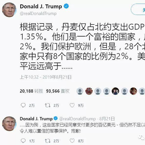 但这只是为了弥补此前出现的关系裂痕。本月中旬,就有消息露出,特朗普多次咨询自己的顾问是不是能买下丹麦的自治领格陵兰岛。后来他自己也证实了这个意向,引发了丹麦和格陵兰政府的骚动,大批他的想法“荒谬”。特朗普还因此推迟了对丹麦的国事访问。