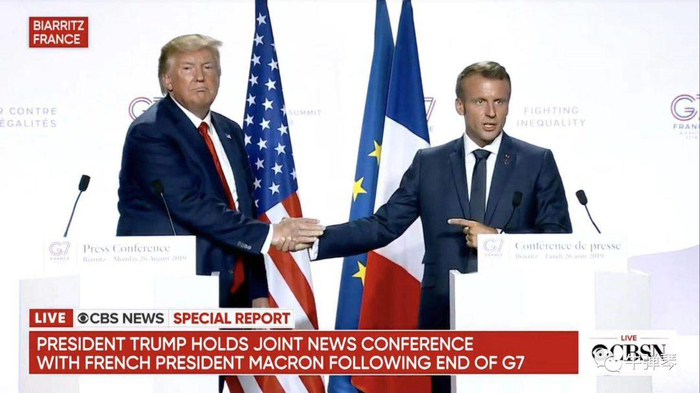 仍旧是这次G7峰会,特朗普和马克龙记者会后,马克龙向特朗普伸出了手,从视频看,特朗普有些犹豫,但最终还是握在了一起。