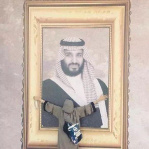 一位身穿灰色长袍、半裹头巾的女性拥抱巨幅王储画像。采访对象供图