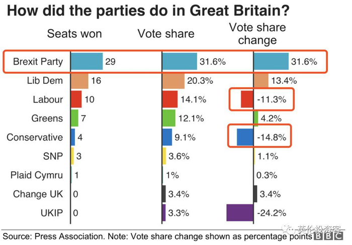 今年5月的欧洲议会选举上,脱欧党拿到了全英73个议席中的29席,成为全英乃至全欧洲议会席位最多的单一政党;自民党排名第二,拿到16席,执政党保守党仅拿下4席,且只有惨不忍睹的9.1%,创下了1832年以来的历史最低记录。