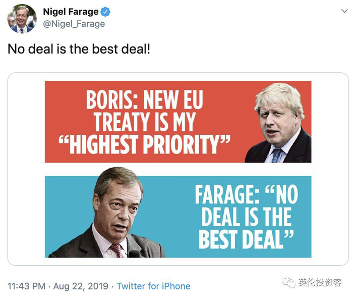 作为首相,鲍里斯非常清楚无协议脱欧的危害性。所以从内心说,他其实还是希望有协议走人的。从这点看来,虽然都是脱欧派,鲍里斯和脱欧党大佬法拉奇还不太一样:法拉奇追求的是最纯粹的脱欧(光脚的不怕穿鞋的),认为无协议就是最好的协议(no deal is the best deal);而鲍里斯认为有协议好过无协议,但如果10月31前没能达成满意的协议(鲍里斯协议),无协议也是可以接受的,否则要是再拖下去,保守党的信用就彻底破产了。
