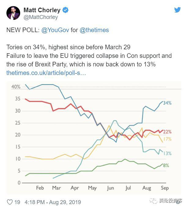 今天(2019年8月29日)刚刚发布的民调显示,保守党支持率一路走高,已经飙升到34%,领先工党(22%)多达12个百分点。