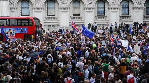 民众带着反脱欧标语和欧盟旗帜一直游行到约翰逊所在的唐宁街,由于人数众多,当地交通一度中断。