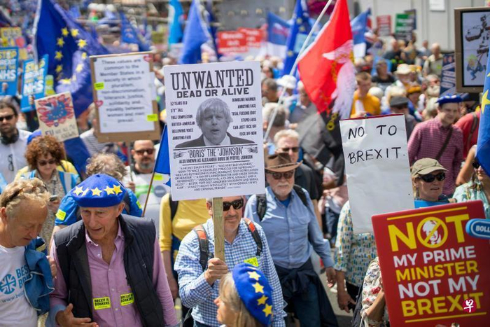 ▲2019年7月,约翰逊当选为英国新首相前,部分英国民众上街表明不要约翰逊,希望英国留在欧盟里。(图:法新社档案照片/原发于《联合早报》)