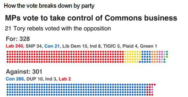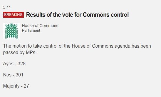 动议得到了328票支持票和301票反对票,也就是说下议院反对派们赢了。脱欧议程的控制权将从鲍里斯手中移交到议会手中,他们将诉求再次延迟脱欧和组织无协议脱欧。