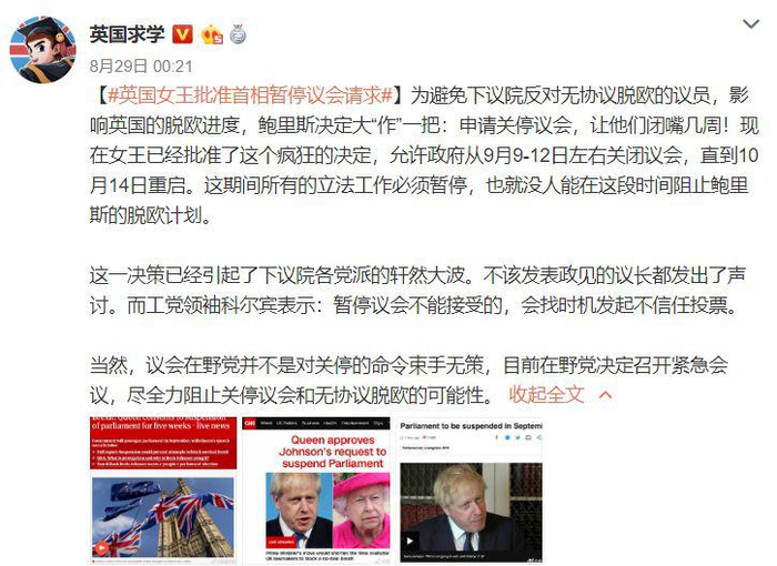 8月29日,鲍里斯请求女王关闭议会。以免那一堆反对脱欧和反对无协议脱欧的下议院议员在脱欧deadline仅剩2个月期间扰乱他制定的脱欧计划。