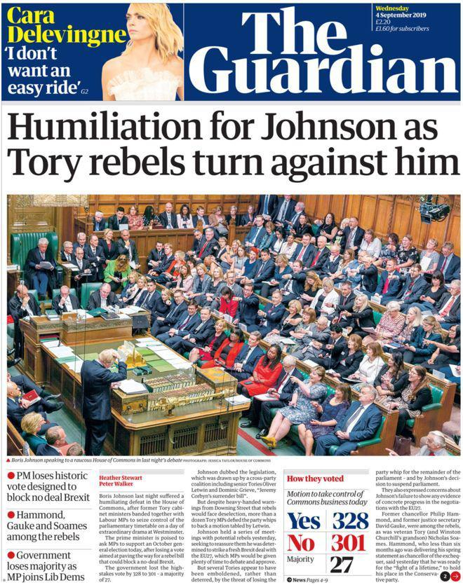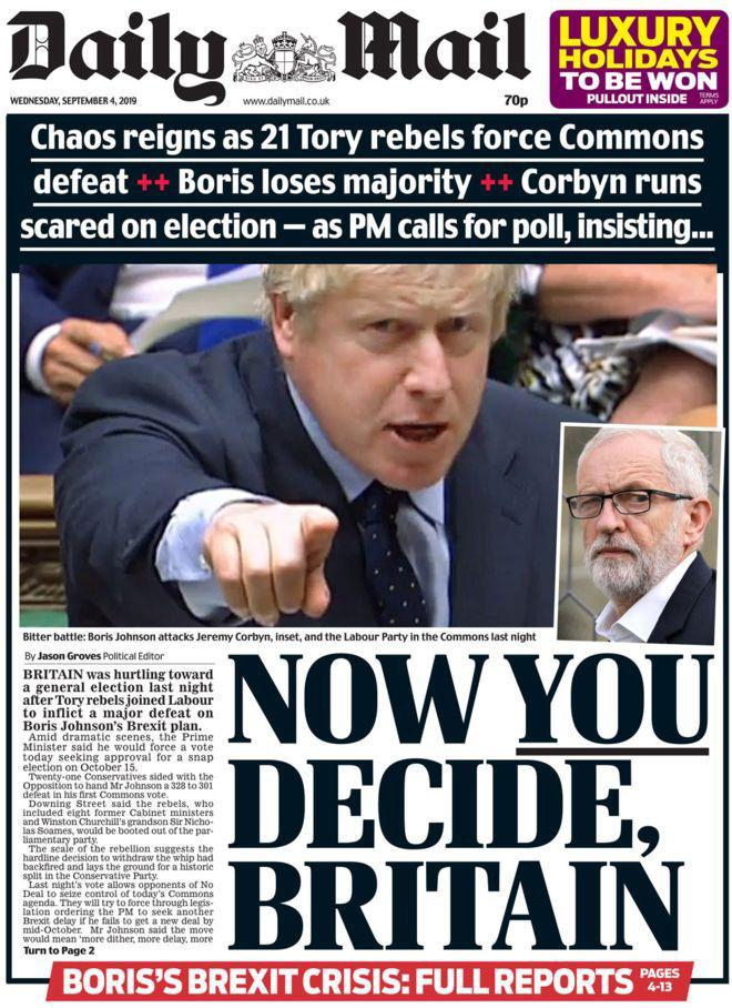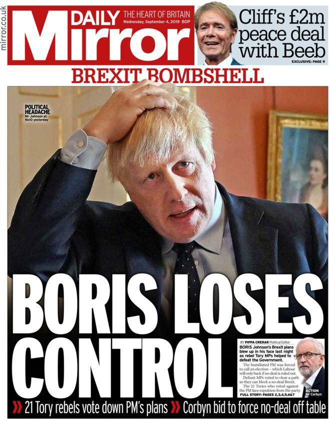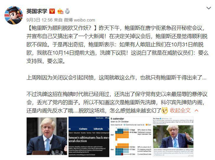 于是就在9月2日,鲍里斯搞了个大新闻!宣称如果有人敢阻止英国10月31日无协议脱欧,那他就敢在脱欧前先发起提前大选。潜台词就是:要么支持我,要么滚,反正保守党的胜算比你们多。