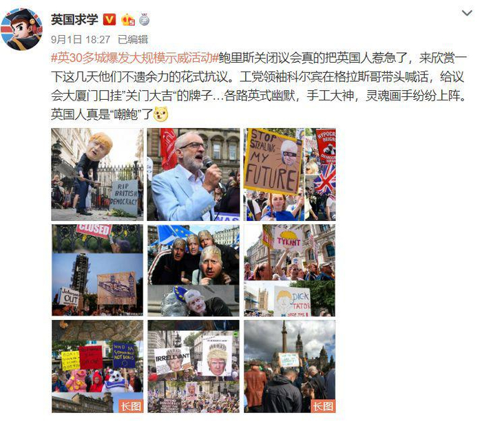 这一举动触发了英国民众的暴怒,全国30多个城市爆发反对鲍里斯的抗议游行,工党党魁科尔宾带头领着大家骂鲍里斯“羞辱民主制度”。