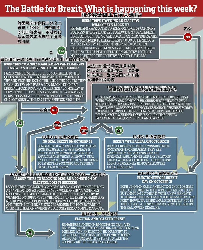 但如果没有顺利发动选举,那么议会仍要按照女王的指示暂停议会。反对党需要在此之前努力通过限制鲍里斯无协议脱欧的法案,如果失败,那么结局很可能就是10月31日无协议脱欧了。