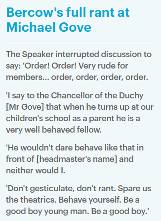 “肃静肃静!我要对Gove先生说,他作为父亲去学校接孩子时可是个表现得相当乖巧的人。毕竟我们都不敢在xxx(该学校校长的名字)面前大吵大闹不是吗?不要打手势,不要咆哮,别让我们看戏了。听话,最好好孩子,做个好孩子。”