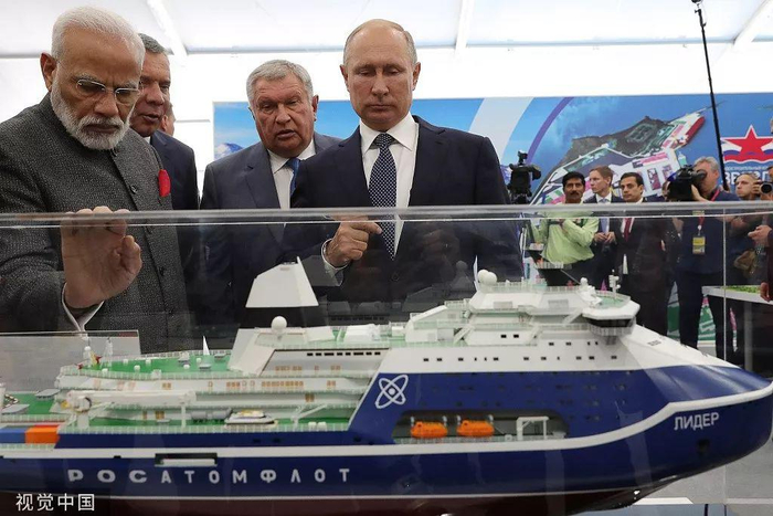 两国领导人共同参观了位于滨海边疆区大卡缅市的“星星”造船综合体,他们观看了造船厂未来将制造的轮船模型。普京特别向莫迪介绍了破冰船模型:“这将是世界上最大的破冰船,它可以冲破厚度达到4米的冰层。该破冰级轮船旨在保证对北极航线的全年引航开路。”