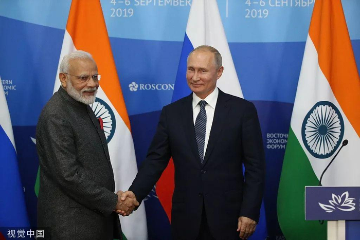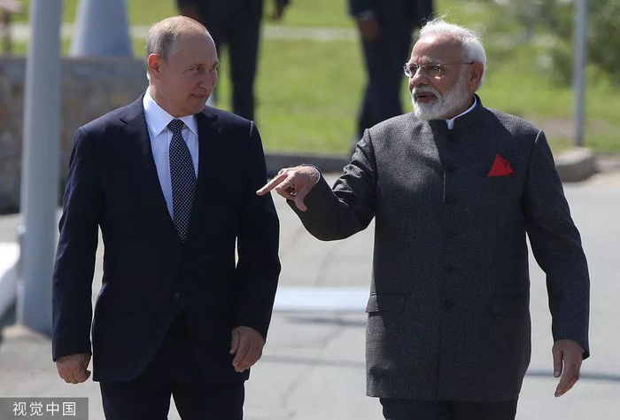 莫迪这次到访俄罗斯,4日几乎一整天的行程都由普京陪同,从参观造船厂到双边会谈,上演了“哥俩好”戏码。莫迪对普京的赞赏溢于言表。