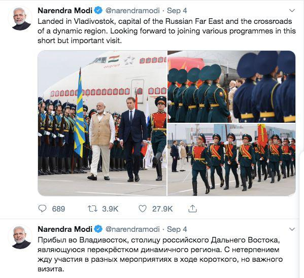 俄罗斯第五届东方经济论坛4日在俄远东城市符拉迪沃斯托克拉开帷幕,印度总理莫迪当天抵达后,第一时间在推特分别用英语和俄语表达对此行的期待。