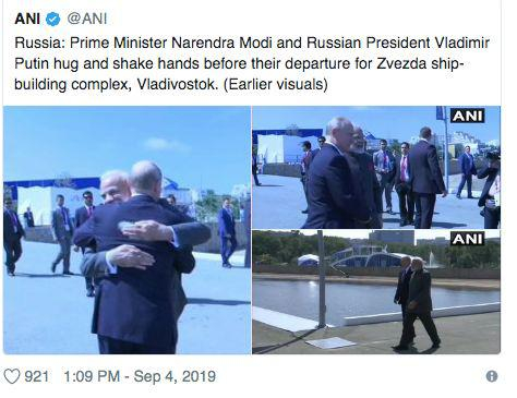 4日,在与普京参观船厂过程中,莫迪连发数条推文,感谢俄罗斯总统陪同,称普京亲切的姿态深深打动了他。