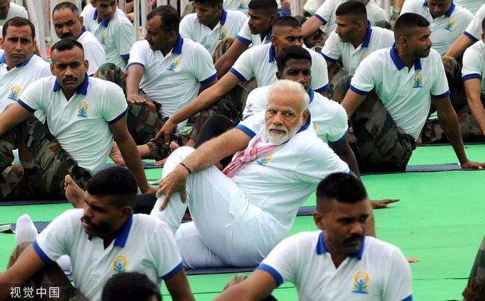 今年6月,莫迪与民众集体练习瑜伽。/视觉中国