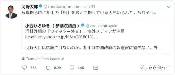 当时日本有个参议员小西洋之,跳出来大骂河野是笨蛋,说华春莹只是发言人,连谈判对象都算不上,这么低的级别,你连这个都不知道吗?