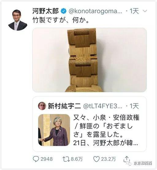 这款竹表其实河野出访时常戴,就这次被人当成金表。结果河野一句“咋了”,反而圈了粉。有粉丝在推特上说:有好好使用纪念品呢,印象好好。