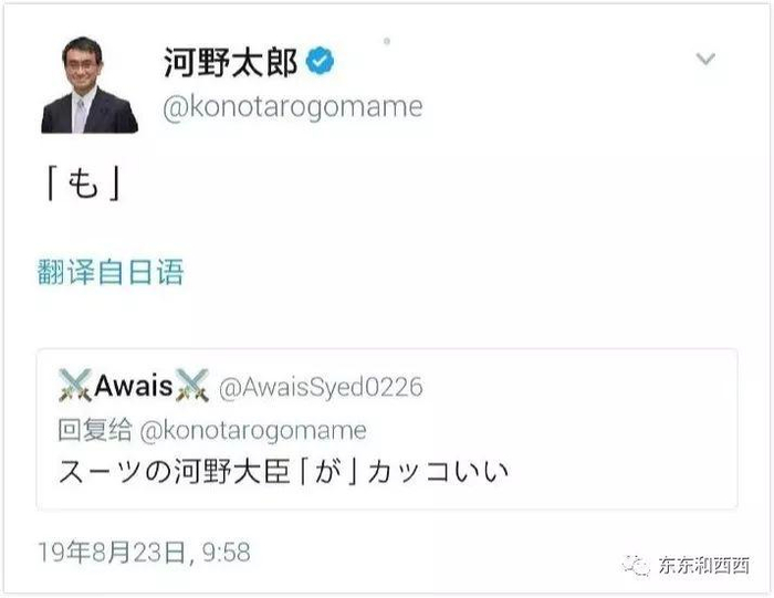 河野:用“也”好吗(潜台词:穿西装的河野大臣也很帅)。