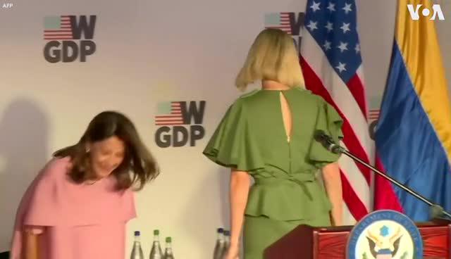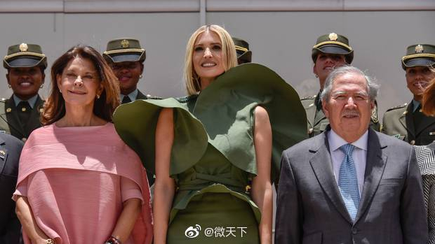 在与哥伦比亚副总统玛塔·露西亚·拉米雷斯和哥伦比亚国防部长吉列尔莫·波特罗合影时,伊万卡的袖子远远超过了她的手臂,形成了两个巨大的圆圈。