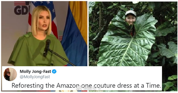 伊万卡的照片也成了网友们恶搞的表情包。网友们开始将伊万卡比作“睡莲”、“卷心菜”和恐龙……作家容·法斯特更是开玩笑说,伊万卡的造型师可能是她的园丁。