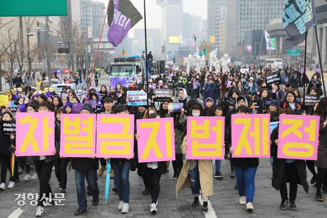 韩国女性在街头抗议男女不平等(图片来源:京乡新闻)