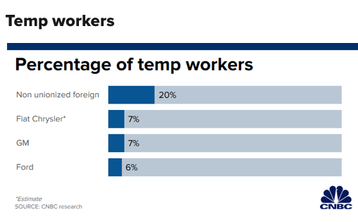 有工会存在的公司一般对员工待遇优厚一些。美国本地工厂的工人薪酬会比其他在美国的外国公司每小时高出$10美元。这些没有工会的外国汽车公司中薪水最高的有梅赛德斯-奔驰,每小时劳力成本是$68,最低的是大众汽车,只有每小时$38, 尼桑和现代在$42 左右。除了工资,UAW的会员工人们有大约每年$9,000和效益挂钩的奖金。根据《汽车新闻》称,每小时十块钱就足以造成每辆车$250的差价,想象一下每年百万的出产量,那叠加的差别是万万不容忽视的。华尔街及很多右翼智库,包括“美国传统基金会”都有过唱衰工会的言论。80年代以来汽车工业罢工现象越来越少,其中原因之一是来自外国,尤其是日本汽车的竞争压力。为了企业的存活,UAW不得不选择和汽车公司一起合作共赢的方式。UAW的领导人说这次罢工是不得已的最后选择。