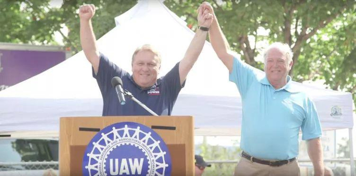 卡车司机联盟支持UAW——总经理浩法和UAW领导人威廉斯在9月8号的集会上。(图片来自www.uaw.org)