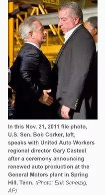 阔克议员(Corker,左)和UAW 地区主任卡斯蒂尔(Gary Casteel)。(ErikSchelzig,美联社)