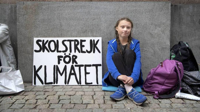 2018年9月瑞典大选前夕,格里塔每天都不去上学,就跑到国会门口静坐抗议,手里举着“为气候罢课”的牌子。
