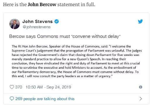 下议院议长约翰·伯考(JohnBercow,中国网友称“咆哮哥”)率先表态,对这一裁决表示欢迎。这位被“脱欧”派视为支持“留欧”的议长,之前曾含泪宣布最迟于10月31日致辞。伯考说,议会“必须毫不拖延地召开会议”,并补充称,他现在将此“作为紧急事项”与各政党领导人磋商。
