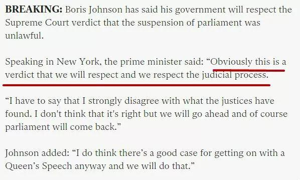 现在已经有英媒在猜测,为了应对最高法院的这一裁决,约翰逊是否立即取消在联合国的行程赶回伦敦。就让我们拭目以待事件的发展吧!