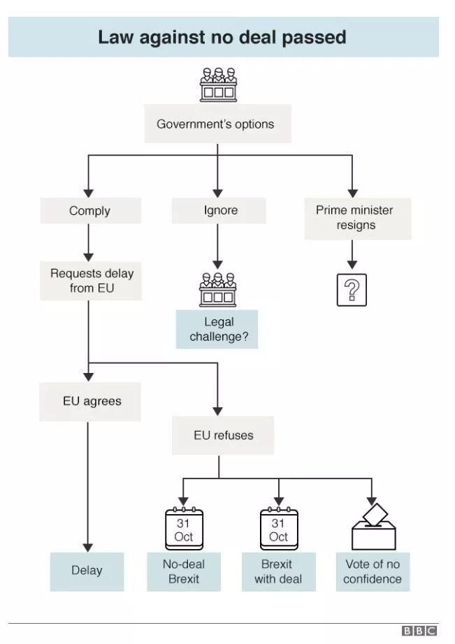 1。 服从法院的判决,按照议会的要求向欧盟申请延期“脱欧”。如果欧盟延期“脱欧”,英国将会再次延期“脱欧,如果欧盟不同意延期“脱欧”,将有可能导致“无协议脱欧”,有协议“脱欧”或首相面临信任投票三种情况;