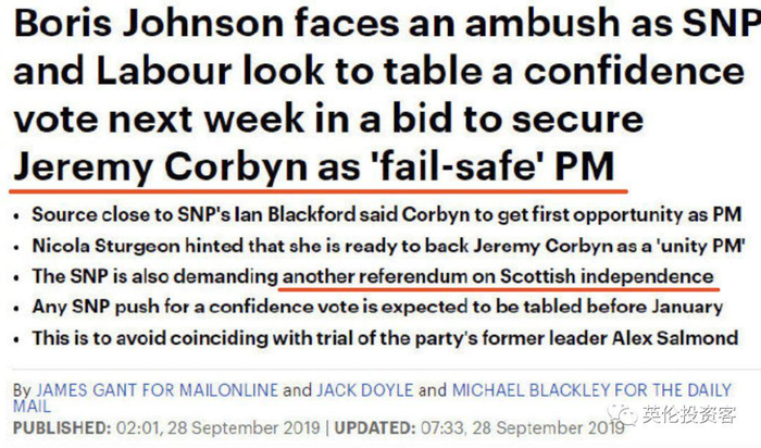 一旦鲍里斯下台,SNP将全力推举科尔宾担任临时首相,以换取科尔宾当上首相后允许苏格兰进行第二次独立公投。