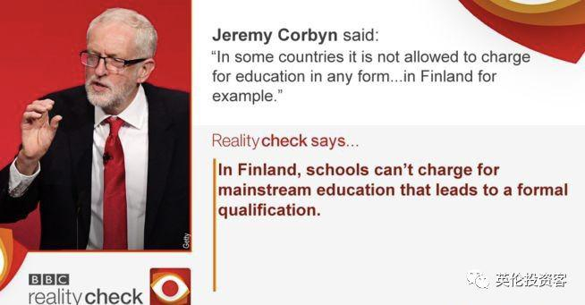 在谈到教育政策时,科尔宾还拿芬兰举例,说像芬兰这样的国家,不允许以任何形式向教育收费。
