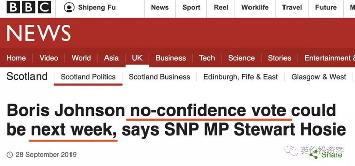 昨天(2019年9月28日),英国媒体曝出当前议会第三大党苏格兰民族党(SNP)密谋和工党合作,准备在下周发动针对现任首相鲍里斯·约翰逊的“不信任投票”。