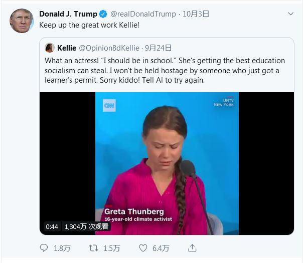 特朗普转发嘲讽瑞典环保少女评论:她就是个演员